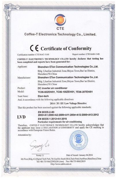 मानक:CE संख्या:CTE16AR-114S मुद्दा तिथि:2016-01-04 कार्यक्षेत्र/श्रेणी:Industrial DC air conditioner(LVD) द्वारा जारी किया गया:CTE |